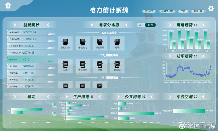 系统实时监测空调系统的能耗数据,包括总耗电量、各区域耗电量、单位面积能耗等,并通过云端平台生成详细的能耗报表。平台以图表形式直观展示能耗变化趋势,帮助管理者清晰了解空调系统的能耗分布情况。