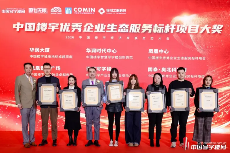 大会颁奖环节星光熠熠,旨在表彰行业标杆、树立发展典范,共设置三大重磅荣誉。其中,“中国楼宇优秀企业生态服务标杆”大奖由中国写字楼网总经理、创始人蔡朝颁奖,北京华贸中心、正大中心、北京中海国际中心(车公庄)、北京招商局大厦、北京都会中心、北京新时代国际中心、钰珵大厦、金长安大厦、国锐广场、华润大厦、凤凰置地广场、华润置地中心、华润时代中心、清汇写字楼、昆仑中心、凤凰中心、国泰·奥北科技园等优质项目上榜,这些项目均凭借精准的定位、优质的空间载体与完善的生态服务体系,成为区域商务典范。