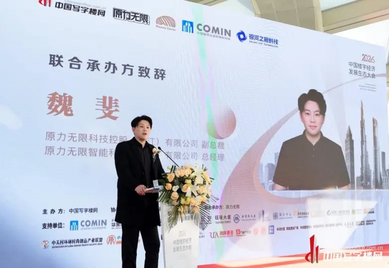 大会启幕环节,行业大咖齐聚发声,共话时代使命。中国写字楼网创始人冯鑫、凤凰东方(北京)置业有限公司副总经理郑强、原力无限科技控股(浙江)有限公司副总裁魏斐等主办方、协办方及联合承办方先后登台致辞,深刻阐释了大会举办的时代价值与行业意义。北京市企业发展促进会会长骆东雨、国锐资产管理公司总经理孙意杰等特邀嘉宾也结合自身深耕行业的实践经验,分享了对楼宇经济生态构建的前沿洞见,着重强调多元协同、共生共荣在楼宇经济高质量发展中的核心驱动作用,为大会奠定了高屋建瓴的研讨基调。