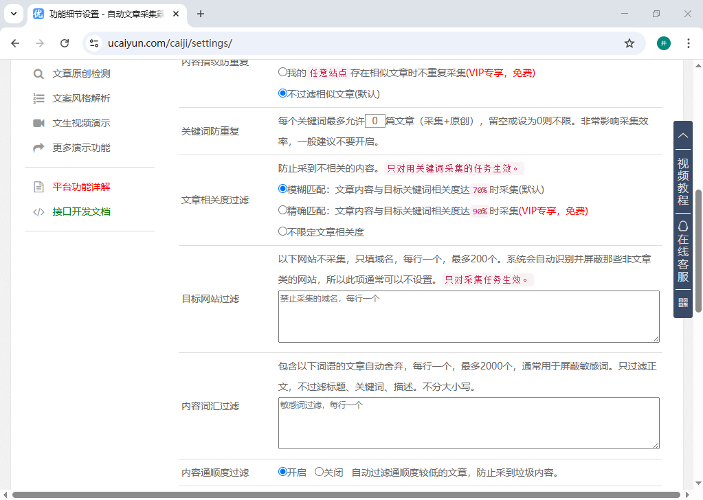 在防重复机制上,系统提供文章网址防重复、内容指纹防重复、关键词防重复三层保护。