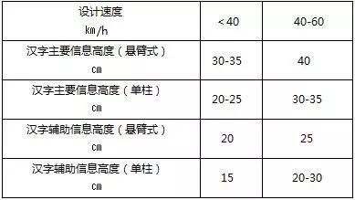施工区域交通标志汉字高度,在快速路上的主标志字高为35-50cm,内环快速宜取上限,辅助标志字高不小于主标志字高的一半,且不小于10cm;一般城市道路标志字高不小于30cm。