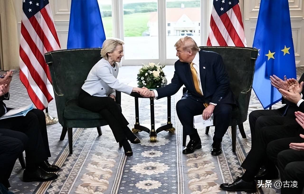 与欧盟的谈判则更为复杂。特朗普通过对欧盟能源依赖的施压,推动谈判进展。2025年7月27日,美国与欧盟在苏格兰的特朗普高尔夫球场签署了框架协议,规定美国对欧盟出口征收15%的关税,比英国的10%还要高。作为回报,欧盟同意向美国投资6000亿美元,并承诺到2028年采购7500亿美元的美国能源。欧盟委员会主席冯德莱恩在记者会上称特朗普是一个出色的谈判者,表示这项协议为双方带来了稳定。然而,欧盟内部对此协议的反应却相当激烈,法国总理贝鲁称这是一种退让。