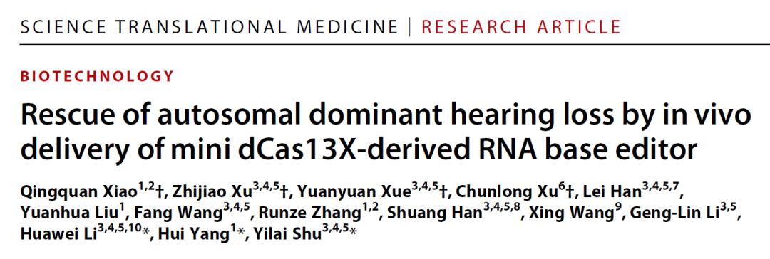 就在上个月,杨辉团队与复旦大学眼耳鼻喉科医院舒易来团队合作在 Science Translational Medicine 期刊发表论文【2】,进行了首个基于RNA单碱基编辑治疗显性遗传性耳聋的临床前研究。详情: