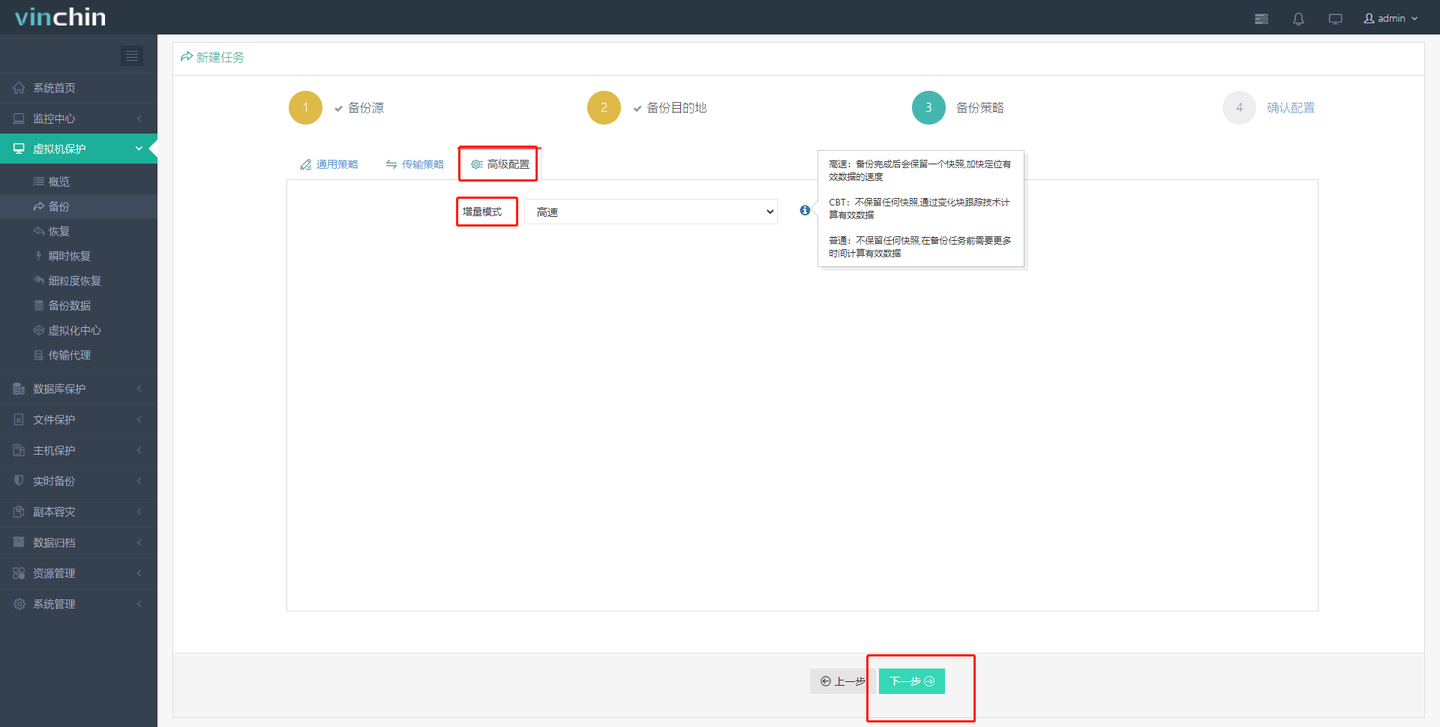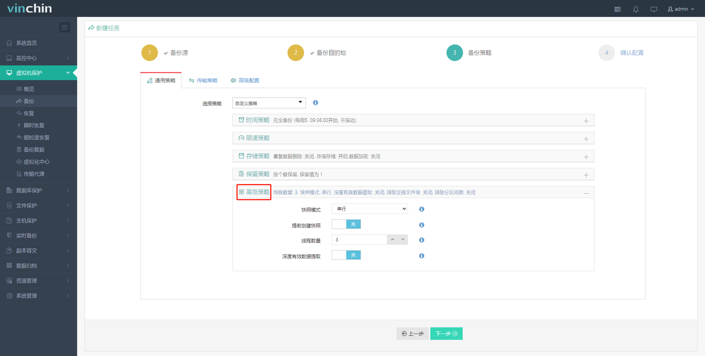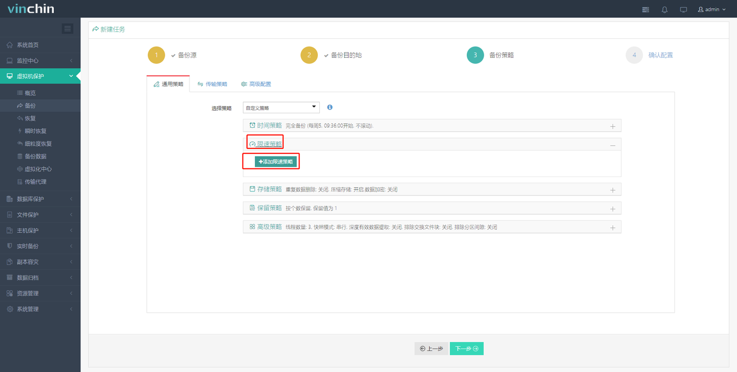5、对备份任务进行其他配置,选择【限速策略】、【存储策略】、【保留策略】、【高级策略】