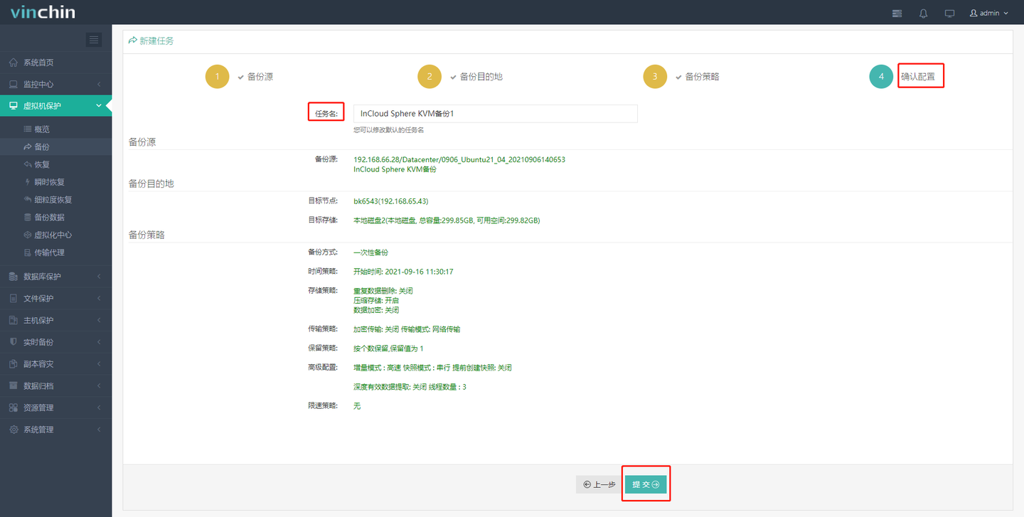 2、选择【虚拟机保护】——【备份】,新建备份任务。选择虚拟化类型【InCloud Sphere KVM】,再选择需要备份的虚拟机,点击【下一步】