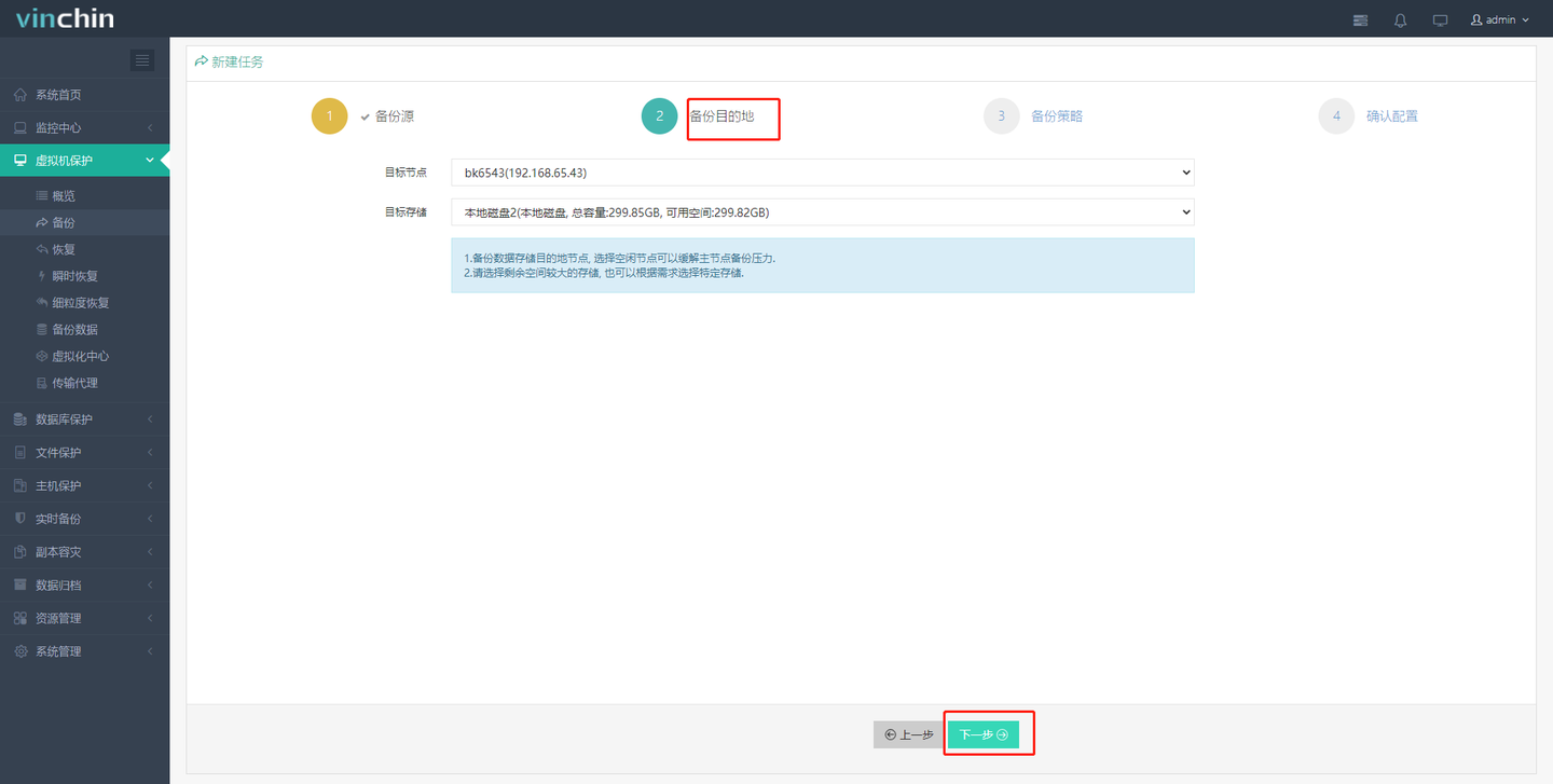 3、设置备份目的地,选择【目标节点】与【目标存储】,点击【下一步】