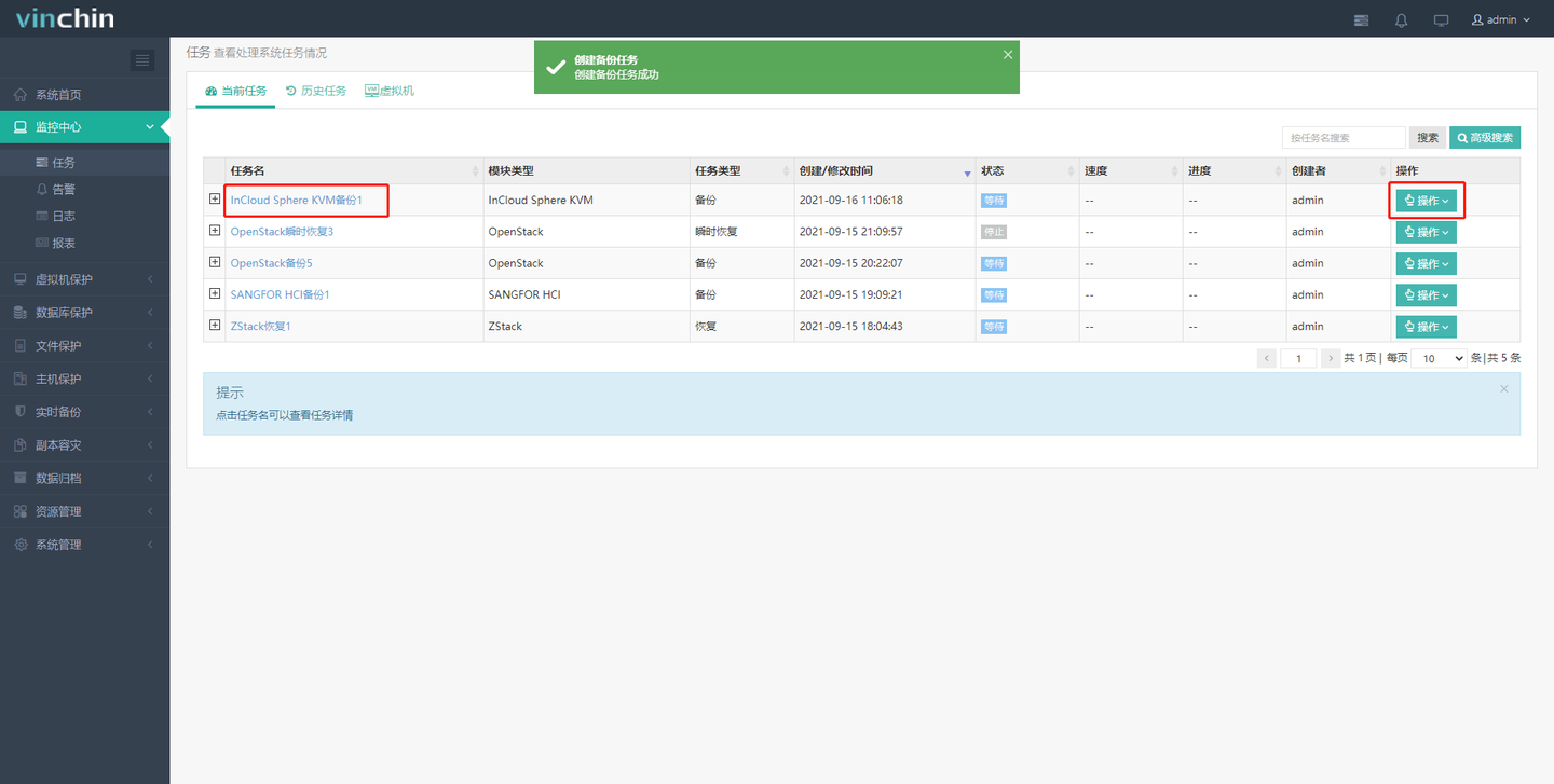 9、提交任务后自动跳转到【当前任务】页面,可以查看刚才创建的备份任务。点击右侧的“操作”按钮可以手动运行或停止任务,也可以等待系统按照设定的策略自动执行备份任务。点击任务名称,可以进入【任务详情】页面。在【任务详情】页面左上方显示任务运行时数据传输的流量速度,右上方显示任务的配置信息,下面显示备份任务的运行日志、虚拟机列表和历史任务。