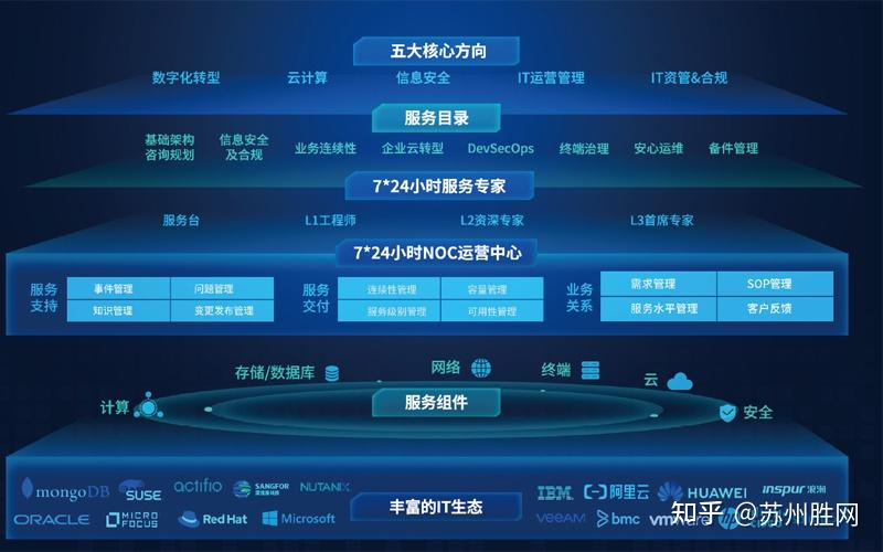 胜网科技深耕IT信息化服务业,已完成了IT解决方案、IT运营管理及IT生态重组的多维体系布局,形成了从IT基础架构平台设计、安全体系建设咨询、业务连续性规划咨询、IT运营服务管理的层次化IT服务格局;同时设有7*24*365的(NOC)技术运营中心,为用户IT建设提供跨生命周期、一站式、全方位的主动服务运营支撑。