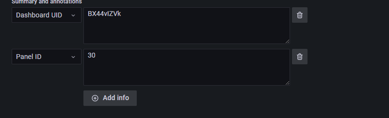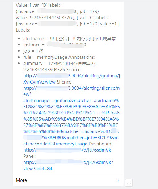 其余的为非必选选项,可以删除。Summary 为可使用模板变量,使得在告警消息中显示出具体的设备名称和值,如 {{$labels.job}} 服务器cpu使用率为:{{values.B}}$,若 A 服务器的 CPU 使用率为90.14,则使用该语句后,在告警消息中会显示出:A 服务器 CPU 使用率为:90.14。更多支持的模板变量见grafana模板变量。