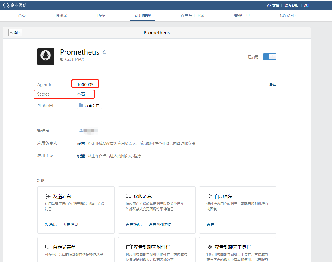 先将 Alertmanager 部署到 Prometheus 所在服务器中。然后在企业微信生成一个专用于告警的应用。