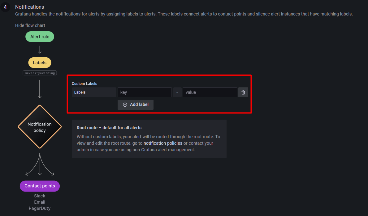 在告警规则建立(4.2节)时,告警组件的最后一步,可以为告警设置一些查询语句中不具有的标签,以供 Notification polices 和 Silence 组件使用。如下所示: