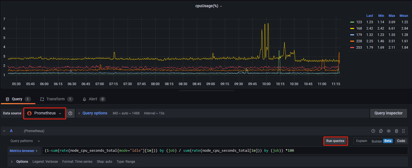 在查询语句栏中输入上述代码,点击 Run queries,便可以获取 CPU 的使用率。