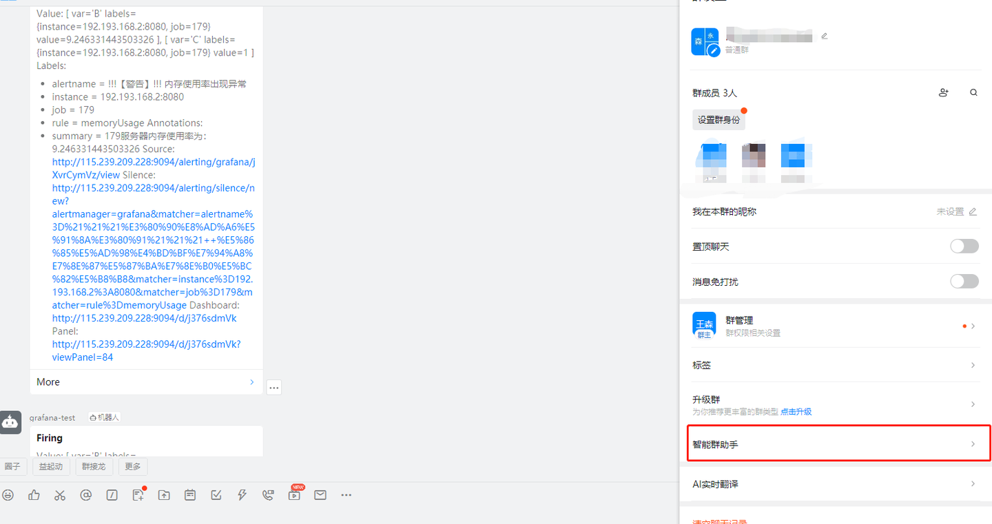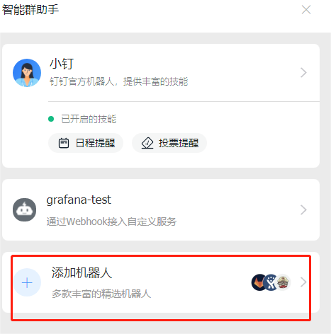 使用钉钉接收告警、预警消息时,要先在钉钉群聊里添加群聊机器人,如下所示