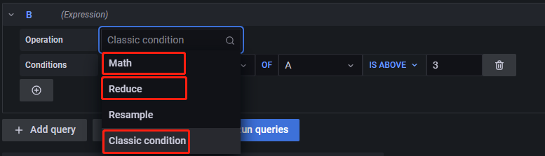 需要明确的是,Grafana 通过接收一个布尔值来决定是否触发告警,当接收值为1时,触发告警,接收值为0时,不触发告警,因此,单一的查询语句无法进行告警(单一的查询语句返回的是具体数值,不是布尔值),还需要一个表达式来返回一系列的布尔值。表达式中一共有四种操作符,如下所示:
