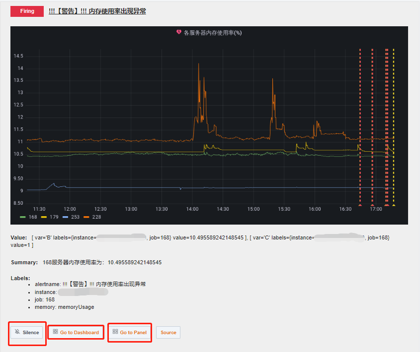 将 http_addr、domain 改为服务器的公网IP。之后邮件里的跳转链接就变成了 root_url,我们就能访问到对应告警指标的监控页面了。