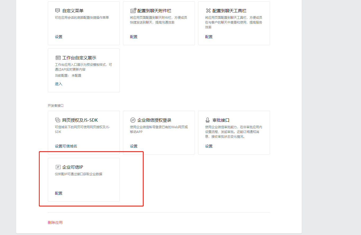 先将 AgentId 和 Secret 记录下来,然后再配置企业可信 IP,如下所示: