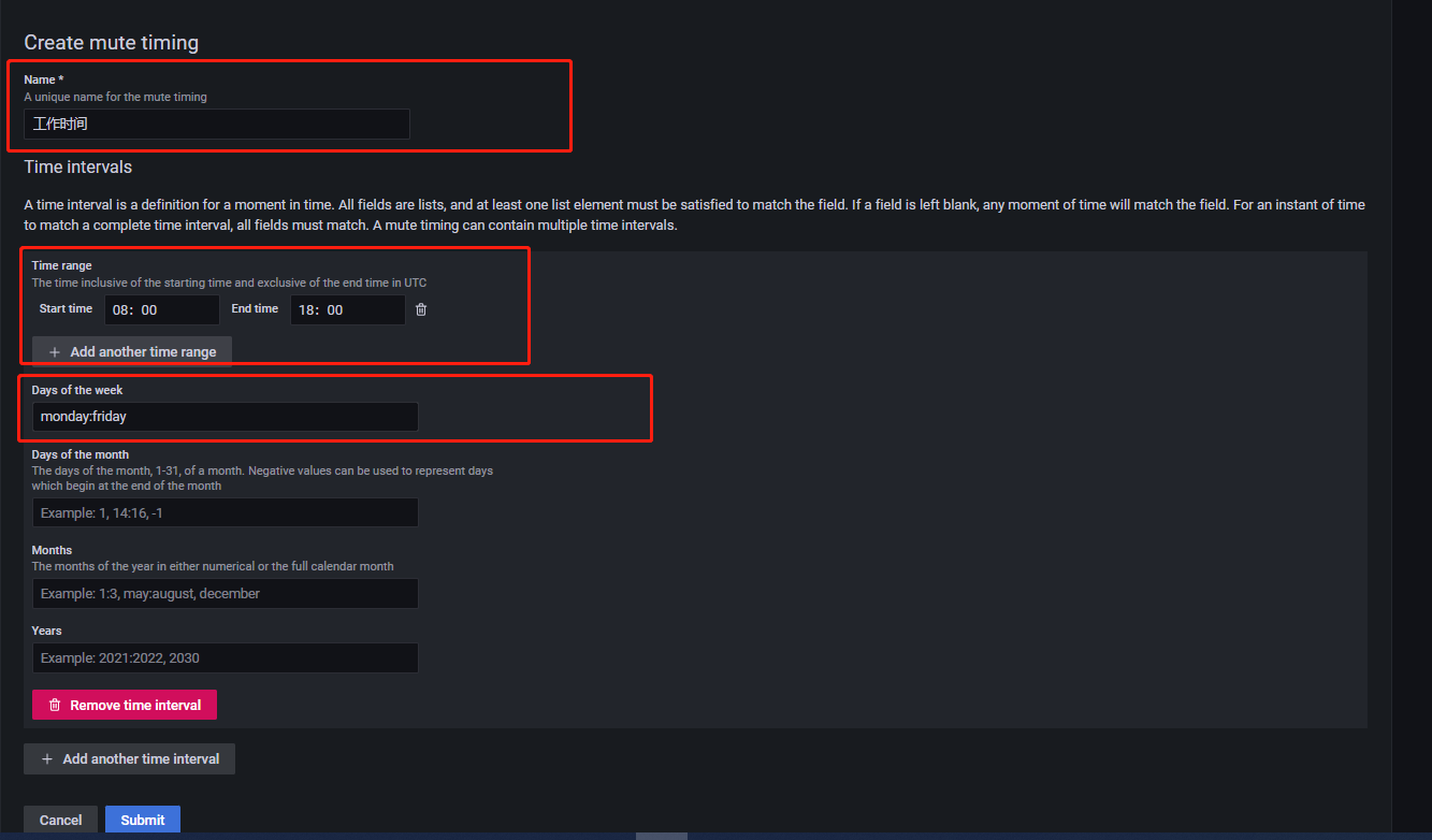 Grafana 提供按特定的时间段收到告警消息的功能,由 Mute timings 组件实现。点击 Add mute timing,进入如下所示页面: