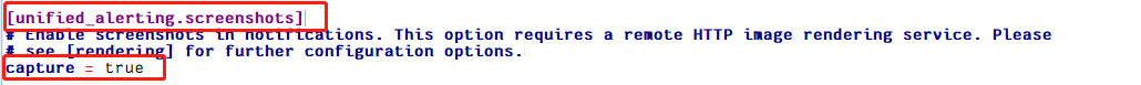要在邮箱告警中显示图片,就要安装 grafana-images/cluster_monitor-renderer。然后修改 [unified_alerting.screenshots] 选项下的 capture,将其赋值为 true,表示在告警邮件中加入图片,如下所示: