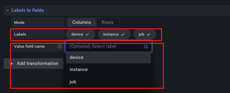 对于查询出来的指标,有时我们只关心它的主要信息,比如说,上图中我们只关心网卡的名称,此时我们只需要如下所示操作,点击 Transform