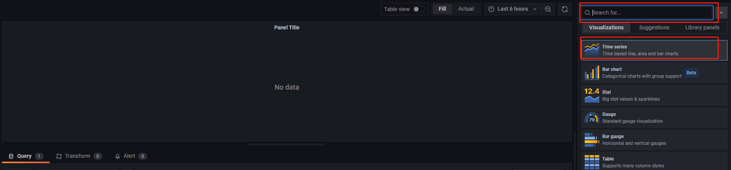 注意,返回的结果的形式必须为一张表。若想将结果展示为 Graph,可以点击右侧的 Visualizations,点击红色方框处下拉列表,选择 Time series,如下图所示: