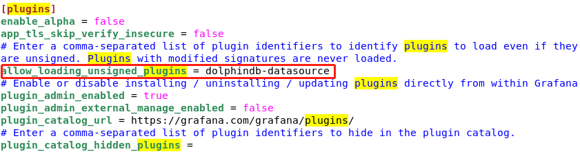 然后需要修改 Grafana 的配置文件,在 /grafana/conf/ 目录下找到 defaults.ini 文件,编辑该文件,找到 [plugins],做以下修改: