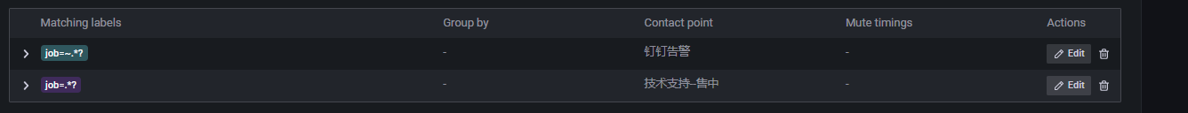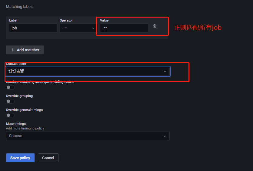 上图已经将邮件作为默认接收者,需要先按照4.4节操作将钉钉设置为消息发送渠道,然后在标签匹配中将所有的告警规则都匹配上,如下所示: