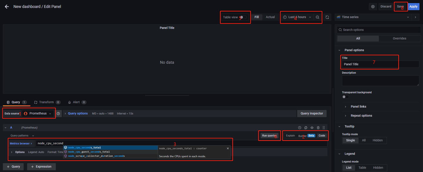 上图中,1为数据源,选择 Prometheus;2为查询方式,建议选择 code;3为查询语句,输入要查询的内容,这里不仅支持简单指标查询,也支持指标之间的运算;4为时间范围;5为展示方式,有 Table 和 Graph 两种选择;6为运行查询,测试查询结果是否符合预期;7是图表的标题;8是保存按钮。