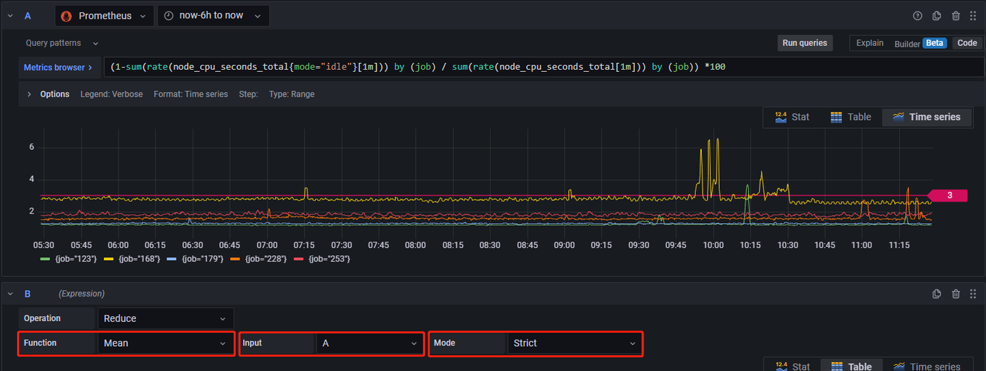 上图中的含义为,将查询语句 A 的返回结果进行分组,然后对分组结果取均值,并且若时间窗口内有 Nan 值,在求均值时将 Nan 视为 Nan,而不是剔除(其余参数含义见 Grafana 官方文档)。