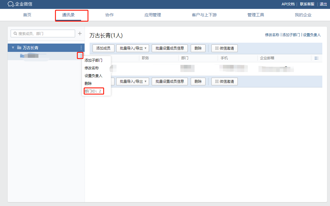 获取到你要接收信息的部门的部门 ID,并记录。最后点击我的企业,如下所示: