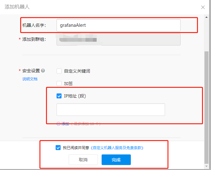 安全设置选择IP地址段,输入你的 Grafana 所在的公网 IP,点击确定后出现如下所示界面: