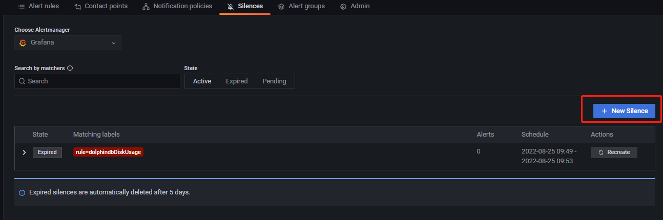 点击 New Silence 添加静默,进入如下所示页面: