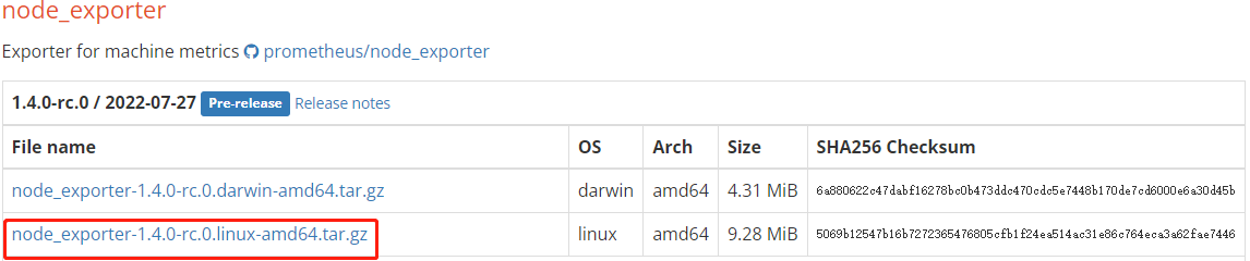 NodeExporter 是 Prometheus 提供的一个可以采集到服务器信息的应用程序,它能采集到服务器的 CPU、内存、磁盘、网络等信息,点击官网链接下载对应版本软件包:
