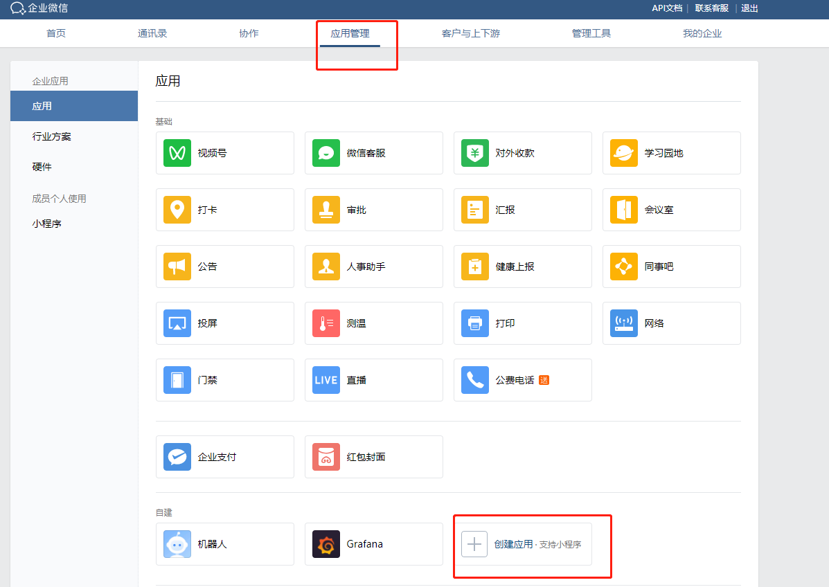 进入企业微信管理后台,点击应用管理-->创建应用如图所示: