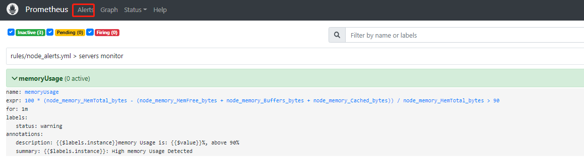启动了 alertmanager 之后,在浏览器地址栏输入 Prometheus 的 IP 和端口,进入 prometheus,然后点击 Alerts,就会出现如下所示界面: