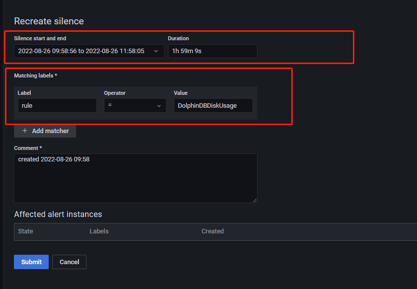 Matching labels 模块通过标签筛选出告警规则,使所选规则在静默时间内处于静默状态。Silence start and end 为静默时间。
