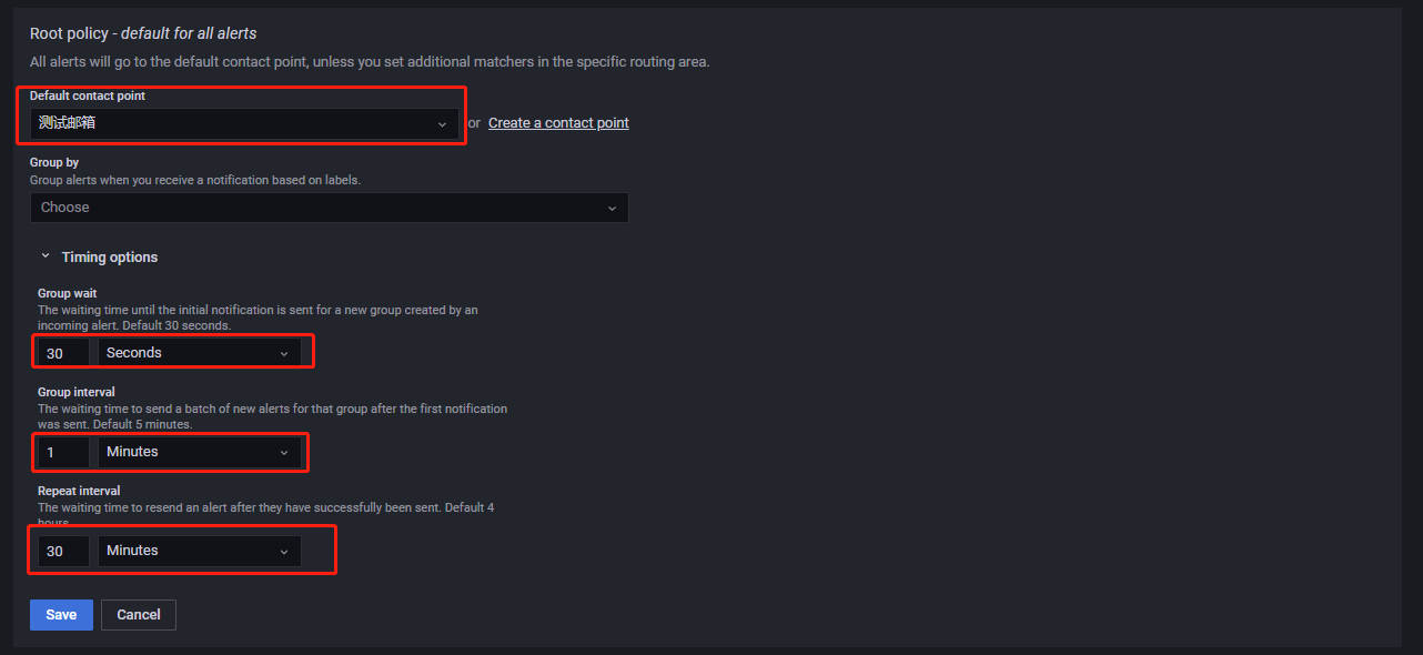Default contact point 为告警消息的默认接收者。