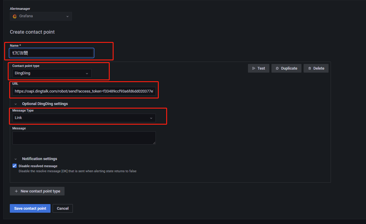 命名为叫钉钉告警,然后 contact point type 选择 DingDing。URL 里填入你刚刚复制的 webhook。Message Type 有 Link 和 ActionCard 两种选择,这里选择了 Link。选择 Link 后,告警消息将以链接的方式发送到钉钉群里,点击链接会跳转到 Grafana 界面。