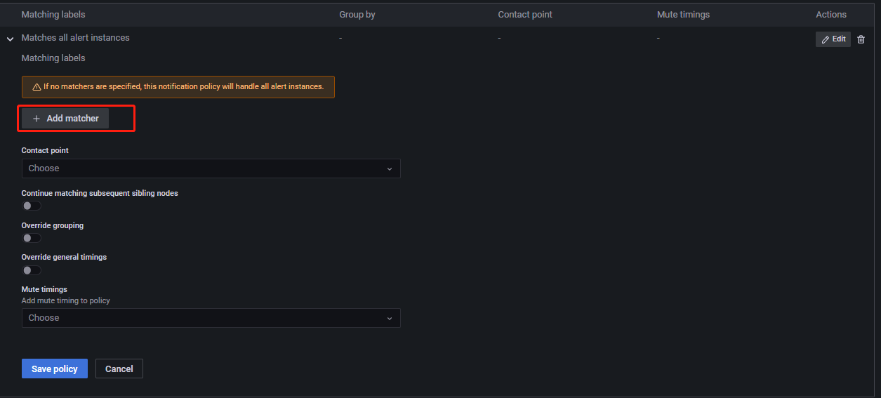 设置好 Contact point 后,还要设置 Notification policies。如果之前已经设置了告警消息的默认接收者,如下所示: