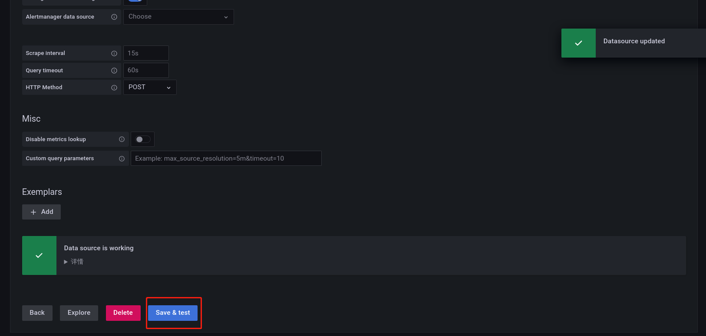 在 URL 上配置 Prometheus 对应的IP和端口(其他选项设置默认),然后点击下方的 Save&test,若出现了 Data source is working 就说明数据源连接成功(若连接失败,检查Prometheus端口是否被占用)。
