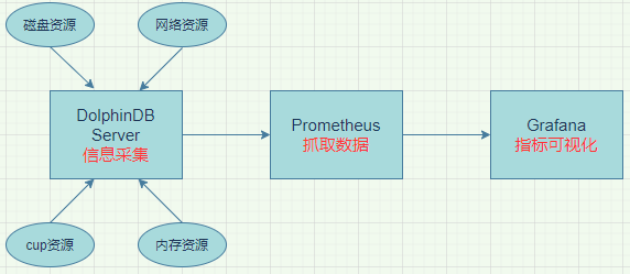 本方案主要用于监控 DolphinDB 进程对服务器资源的使用情况及 DolphinDB 性能,如 DolphinDB 进程 CPU 占用情况、DolphinDB 进程内存占用情况、DolphinDB 进程磁盘资源使用情况等。DolphinDB 内置了相应的运维函数以获取当前节点的资源使用情况,Prometheus 可以抓取到这些指标。本方案中 Prometheus 定时从 DolphinDB 抓取相关指标,再由 Grafana 对 Prometheus 采集的指标信息进行可视化展示。