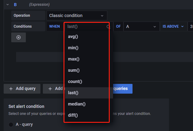 上图中的 Conditions 中的含义为,若在时间窗口中查询语句A的返回结果最后一个值大于3,返回1,否则返回0,对应的操作为 WHEN=last(),OF=A,IS ABOVE=3。也可以选择其他条件,如,若在时间窗口中A的平均值小于50,触发告警,对应的操作为 WHEN=mean(),OF=A,IS BELOW=50。此外,可供的选择有很多种,如下所示: