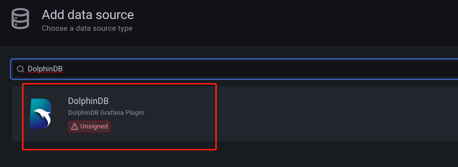 修改配置文件之后,需要重启Grafana服务。重启后,在Grafana中添加dolphindb-datasource数据源,在搜索框输入DolphinDB,然后点击下方出现的结果,如下图所示: