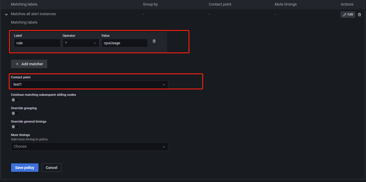 Matching labels 通过标签及对应的值来选择该接收者要接收的告警消息。上述将有 cpuUsage 标签的告警消息发送给 test1。