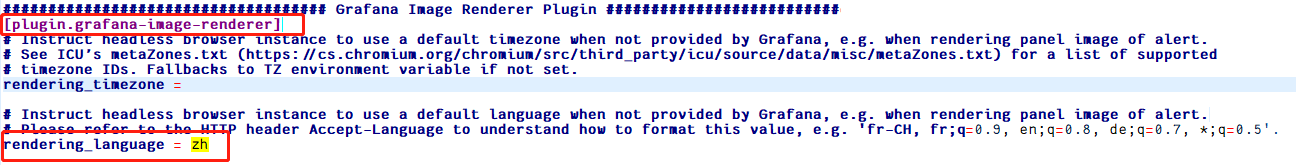 然后修改 [plugin.grafana-images/cluster_monitor-renderer] 选项下的 rendering_language,将其赋值为 zh,表示告警图片中支持中文显示,如下所示: