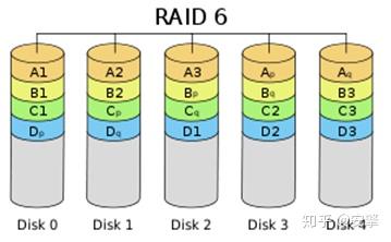 双分布奇偶位条带是在 RAID5 的基础上为了进一步增强数据保护而设计的一种 RAID 方式,它可以看作是一种扩展的 RAID5 等级。RAID6 具有快速的读取性能、更高的容错能力。但是,它的成本要高于 RAID5 许多,写性能也较差,并有设计和实施非常复杂。RAID 6 与RAID 5相比,增加了第二个独立的奇偶校验信息块。 两个独立的奇偶系统使用不同的算法, 数据的可靠性非常高. 即使两块磁盘同时失效,也不会影响数据的使用。 但需要分配给奇偶校验信息更大的磁盘空间,相对于RAID 5有更大的“写损失”。至少需要4个驱动器组建。
