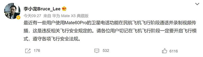 国内最早支持卫星通信的手机是2022年发布的华为Mate 50 Pro。后来在Mate 60 Pro发布的时候,有人不仅拍下自己在飞机上用卫星通信打电话的视频,还把视频发到了网上。这个事件惊动了华为终端BG CTO李小龙,他专门发微博提醒用户遵守飞行安全法规,不要乱来。