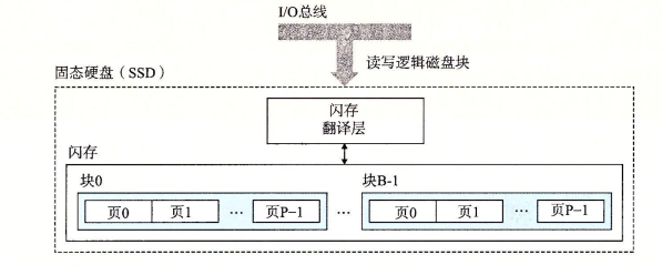 固态硬盘是一种基于闪存的存储技术。SSD封装插到I/O总线上标准硬盘插槽中,行为与其他磁盘一样,处理来自CPU的读写逻辑磁盘块的请求。一个SSD封装由一个或多个闪存芯片和闪存翻译层组成,闪存芯片替代传统旋转磁盘中的机械驱动器,而闪存翻译层是一个硬件/固件设备,扮演与磁盘控制器相同的角色,将对逻辑块的请求翻译成对底层物理设备的访问。