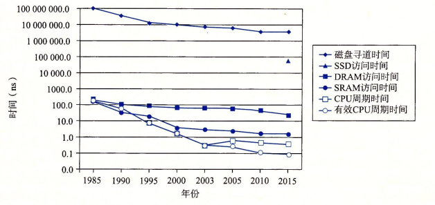 不同的存储器与CPU性能属性以截然不同的速率变化着。从1985年到2010年,CPU的有效周期时间提升了大约2000倍,2003年附近的突变是由于多核处理器的出现。SRAM的访问时间提升了大约100倍,DRAM的访问时间提升了大约10倍,磁盘的访问时间提升了大约25倍。可以看出SRAM比DRAM与磁盘访问速率多跑出了一个数量级。DRAM与磁盘性能的提升远远滞后于CPU性能的提升。