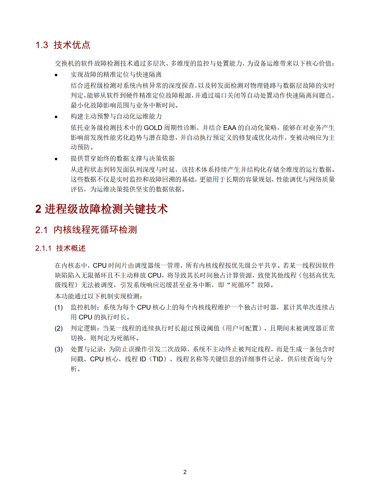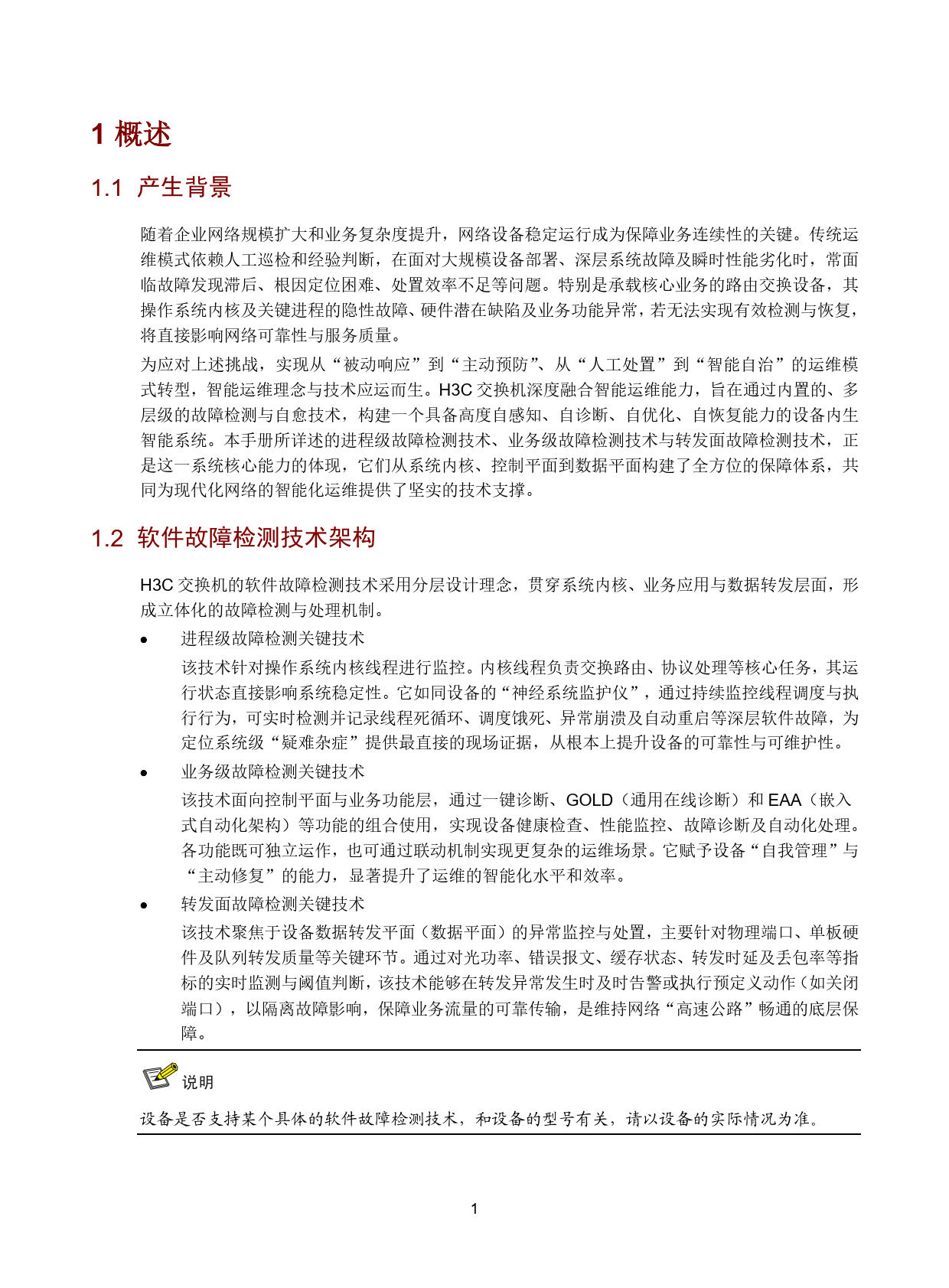 随着企业网络规模扩大和业务复杂度提升,传统依赖人工巡检的运维模式面临故障发现滞后、根因定位困难等问题。H3C 交换机软件故障检测技术应运而生,旨在实现运维模式从 “被动响应” 到 “主动预防”、“人工处置” 到 “智能自治” 的转型。该技术采用分层设计架构,涵盖进程级、业务级和转发面三个核心层面,形成全方位保障体系,从系统内核、控制平面到数据平面实现立体化故障检测与处理。
