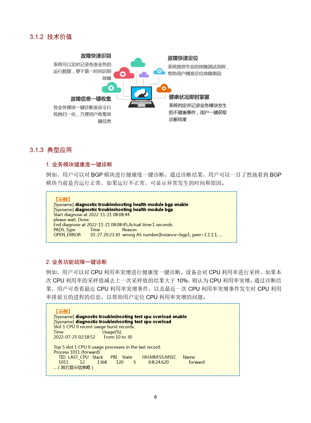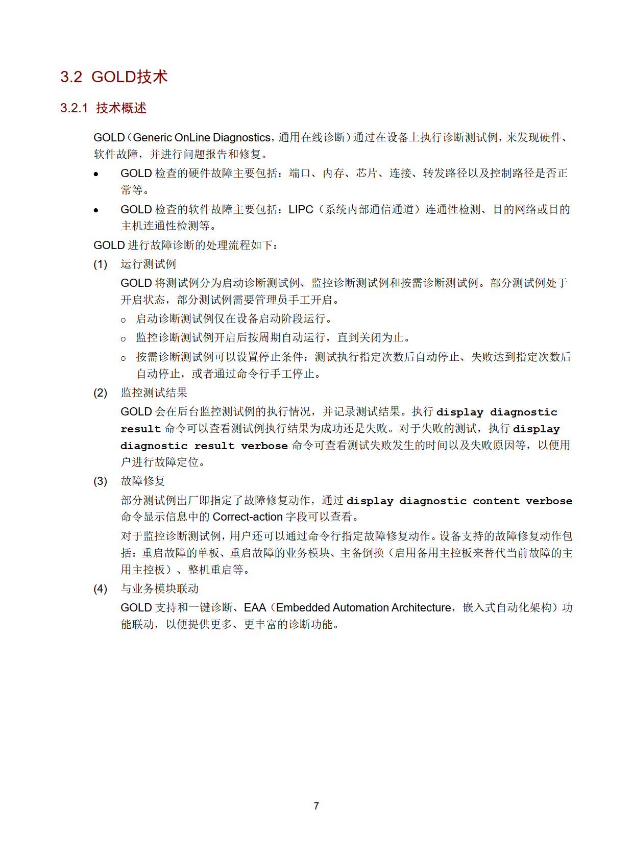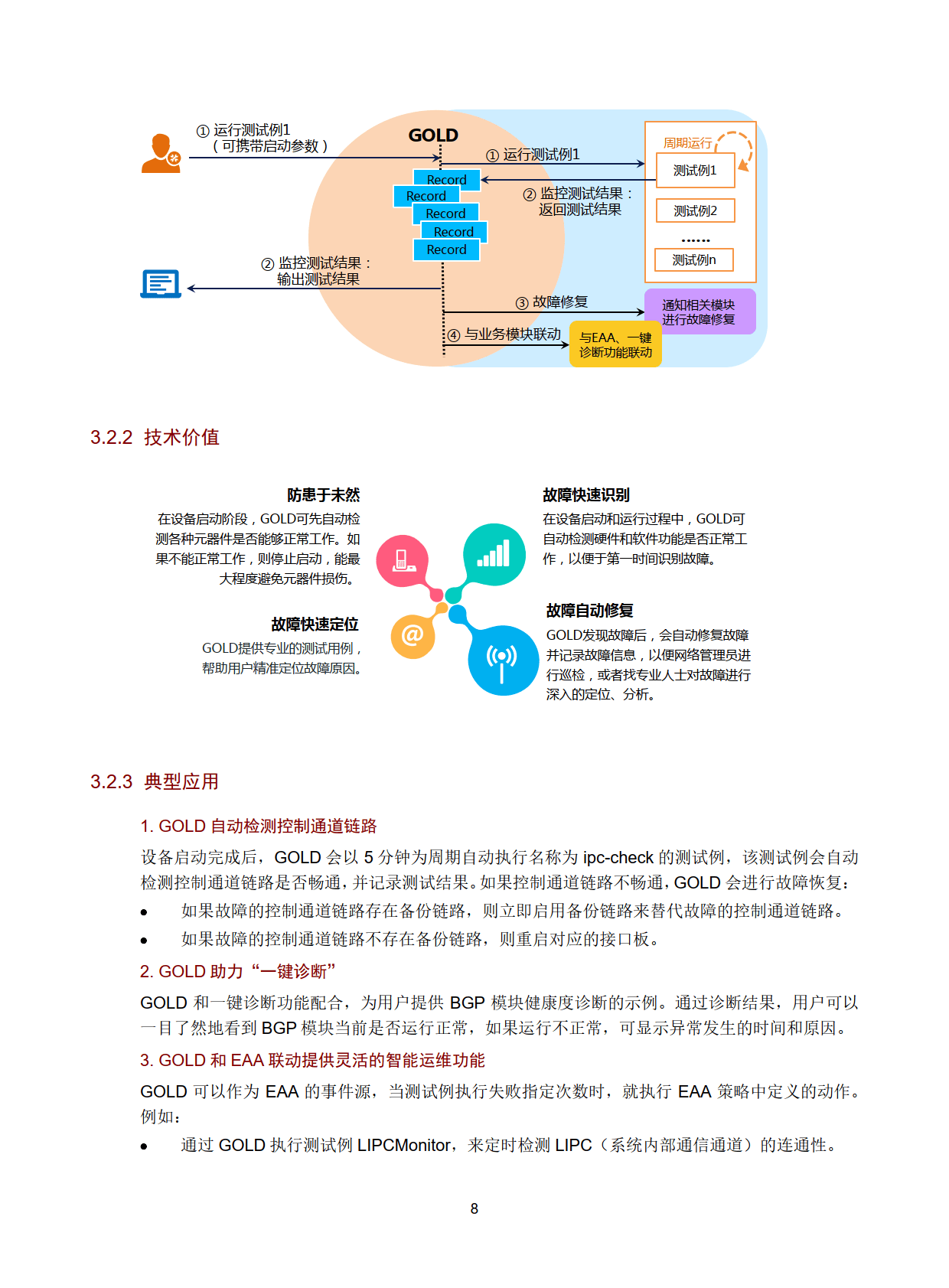 面向控制平面与业务功能层,核心技术包括一键诊断、GOLD 和 EAA,且支持多技术联动。一键诊断 24 小时不间断监控软硬件业务模块,实现故障快速识别与定位;GOLD 通过启动诊断、监控诊断和按需诊断三类测试例,完成软硬件故障检测与自动修复;EAA 支持用户定制监控策略,通过事件与动作的灵活组合实现自动化运维。三者联动可拓展诊断功能边界,提升运维灵活性与智能化水平。